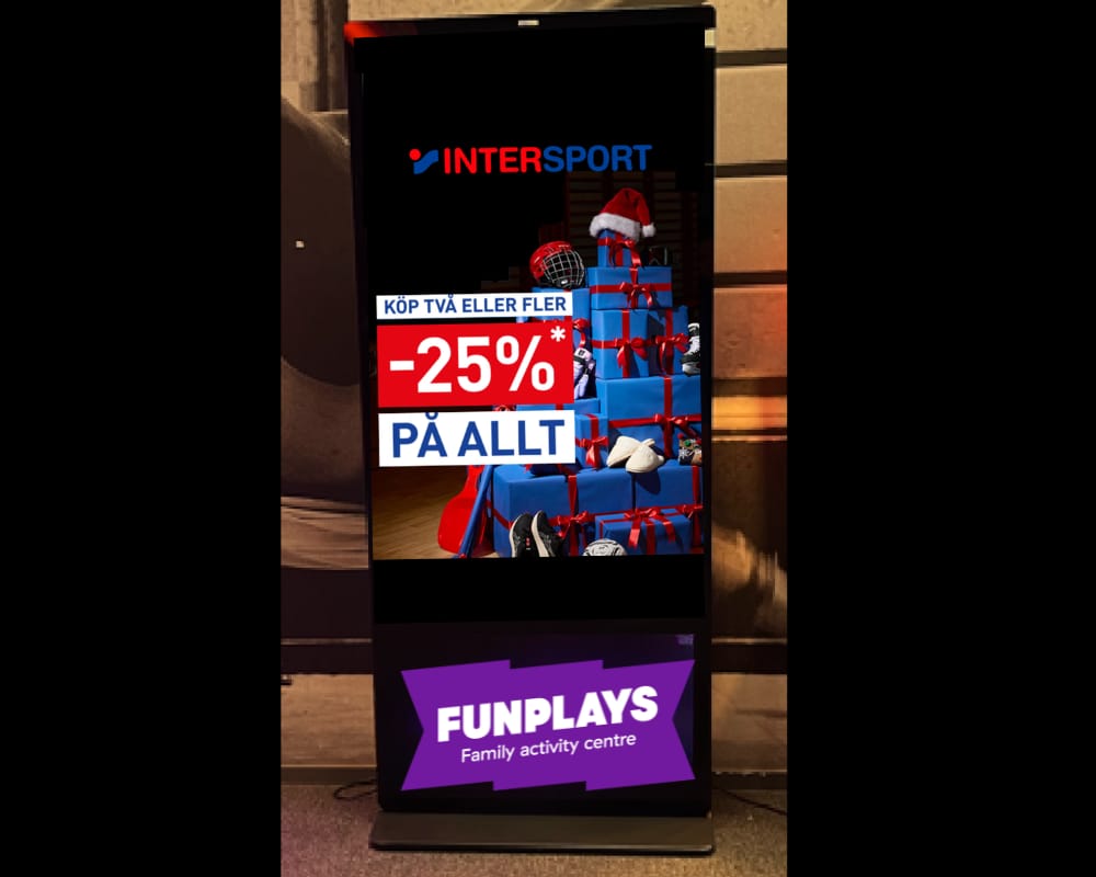 Skärmarna är strategiskt placerade vid ingången samt restaurangen inne i Funplays. Här når ni på ett enkelt sätt såväl, barnfamiljer som mor/far-föräldrar.