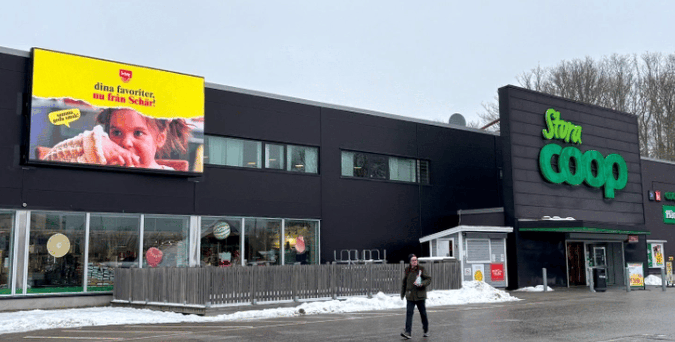 Digital skärm placerad på fasaden till Stora COOP Karlshamn. Ytan är 21 kvm och riktar sig ut mot besökarna precis innan köptillfället samt förbipasserande.